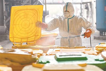新冠肺炎疫情發(fā)生后,每天產(chǎn)生的巨量醫(yī)療廢物成為武漢市亟待解決的重要問(wèn)題。圖為近日,在武漢市青山區(qū)云峰公司,工作人員在對(duì)醫(yī)療廢物轉(zhuǎn)運(yùn)箱消毒。新華社記者 才揚(yáng) 攝3月11日,記者從國(guó)務(wù)院聯(lián)防聯(lián)控機(jī)制新聞發(fā)
